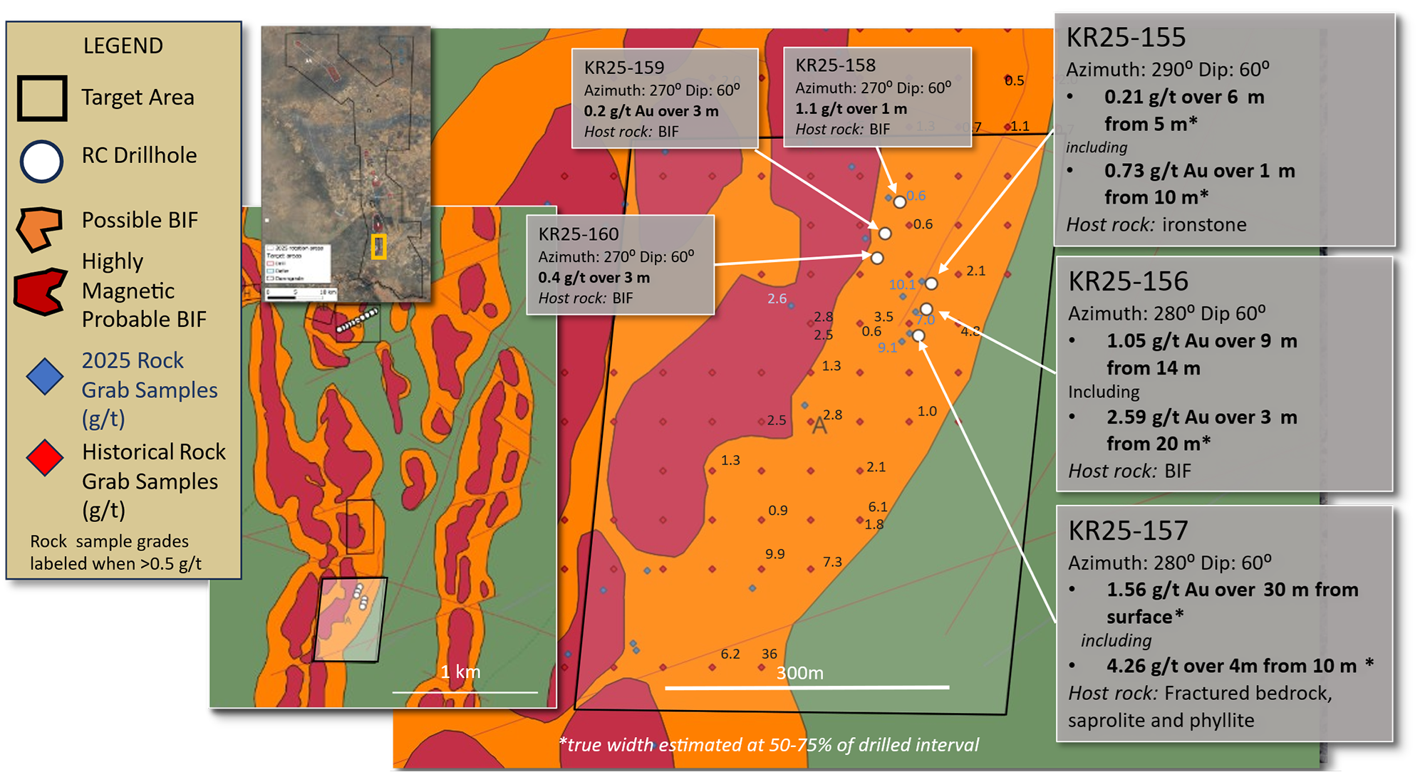 | A (new) | Hole KR 25-157 30 m @ 1.56 g/t Au from surface |