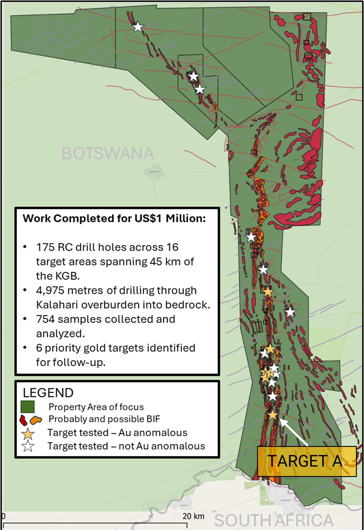 "Target A's intercept of 1.56 g/t Au over 30 m represents a breakthrough intersection for Kraaipan," stated Eira Thomas, President and CEO of North Arrow. "These grades are comparable to those observed at the nearby Kalgold mine, which is a multi-million-ounce gold resource that has been in continuous production for over 25 years. This validates our exploration approach and demonstrates the significant gold potential of this underexplored belt."